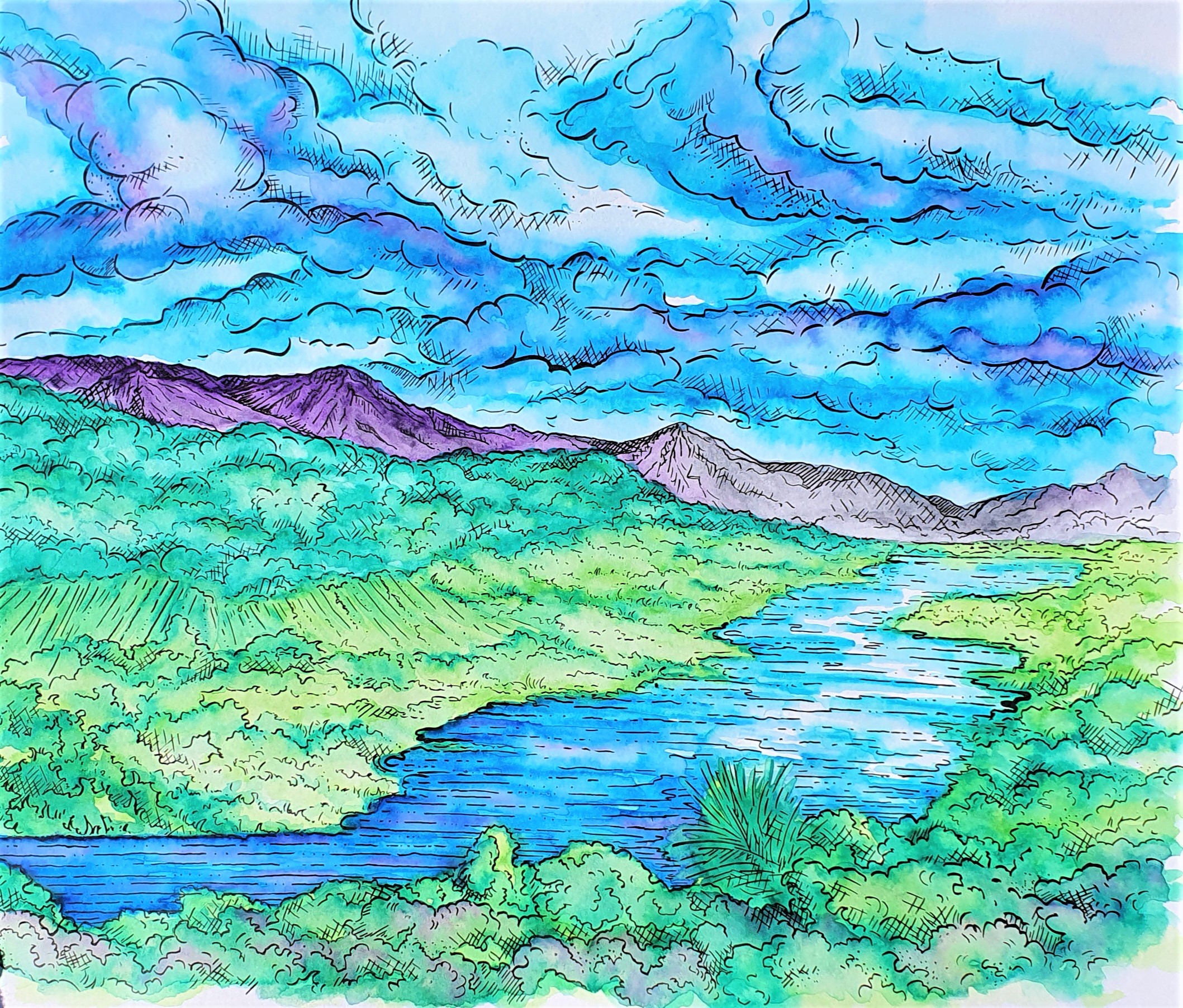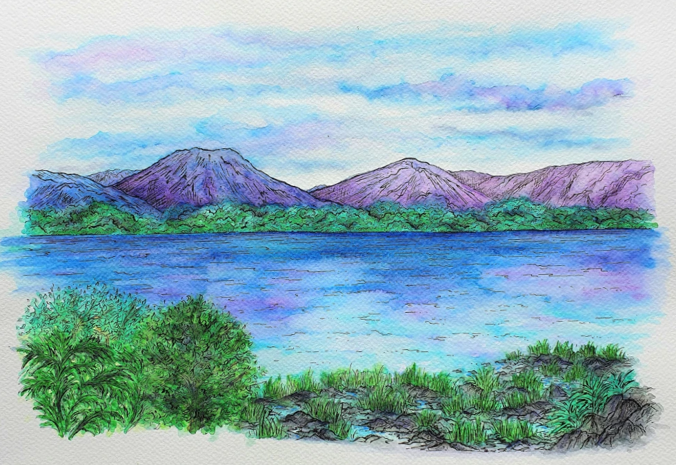 This is Loch Morlich in Aviemore. A place that is incredibly beautiful even on a grey driech day, of which it is true there are a few. I wanted to showcase all the beautiful blue hues, greens, heather purples and rich umbers that this landscape offers. Every time I paint this loch I am reminded of sitting here with my partner whilst on holiday. We watched the sunset whilst eating fish & chips with the stunning mountains of the Cairngorm National Park ahead of us and tried to avoid the chip hungry ducks!